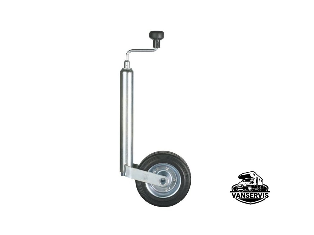Výškově stavitelné opěrné kolečko Winterhoff ST 48-200 VB s nosností 150 kg (90 kg při manipulaci) usnadňuje ruční připojování a přesun přívěsu. Má ocelový tubus (Ø 48 mm), výsuv 220 mm, otočnou vidlici s gumovým kolečkem (Ø 200 mm), axiální ložisko a robustní plastovou kličku. Montáž do držáku (není součástí).